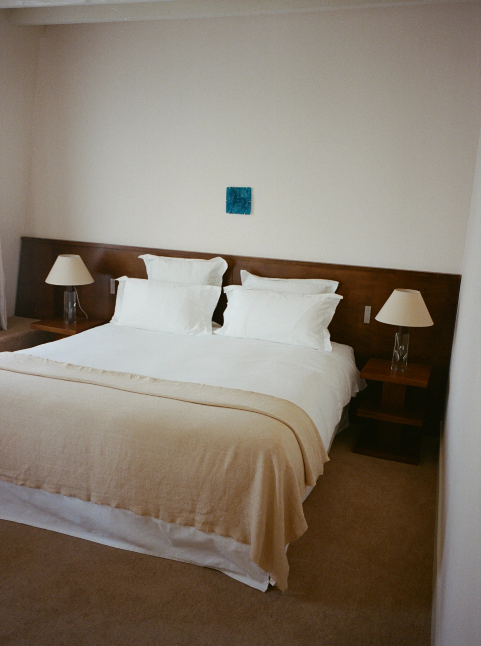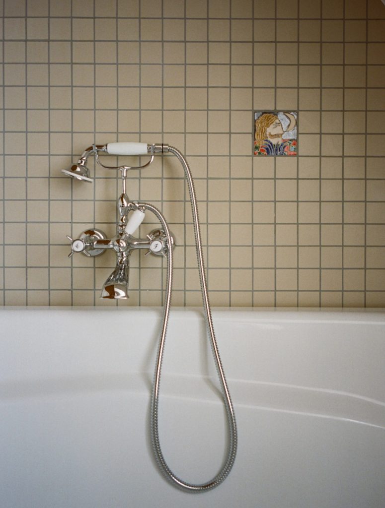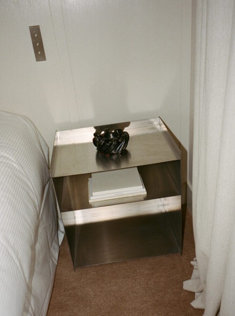 The design philosophy blends minimalist restraint with thoughtful eclecticism. Custom-made furniture sits comfortably alongside ’70s-era vintage pieces, while subtle references to Parisian cultural heritage and craftsmanship abound – from hand-woven fabrics and bespoke cabinetry crafted from reclaimed wood to ceramic bathroom tiles by artist Héloïse Rival. Art, intentionally integrated throughout the interiors, plays a role as essential as materials: abstract works by Eduardo Lalanne and site-specific installations by Christian Rosa animate walls and corridors, creating visual dialogue rather than mere decoration.