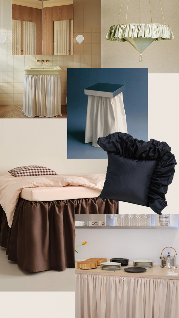 Furniture is embracing a playful, romantic twist—volants (ruffles) are everywhere! From lamps dressed in delicate pleats to beds wrapped in soft, frilly covers, even the once unappealing clutter on shelves is now hidden behind folded fabric. This trend adds a cozy, whimsical touch to any home, offering a sense of warmth and charm. The best part? It’s completely adaptable. You can let the frills take center stage in full romantic flourish, or balance it out with a modern contrast – like sleek stainless steel furniture. It’s a look that invites fun, comfort, and a bit of cheeky elegance.